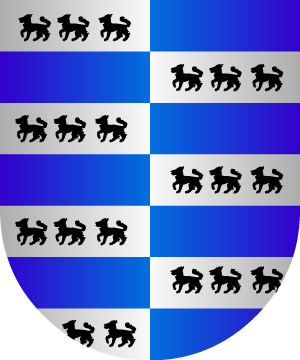 16.- Según P. Costa: De azur, un palo de plata, acompañado de dos leones rampantes y vueltos de oro, linguados y armados de sable.
