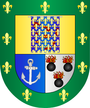 Otra versión del escudo anterior es: Cortado: Primero: En Oro, Un estandarte, de azur, cargado de cinco lises, de oro, salpicado de sangre; Segundo: en plata, tres bombas de cañon, de sable con llamas de fuego. Bordura de sinople, con nueve flores de lis, de oro. (ref.: SARANDESES). |